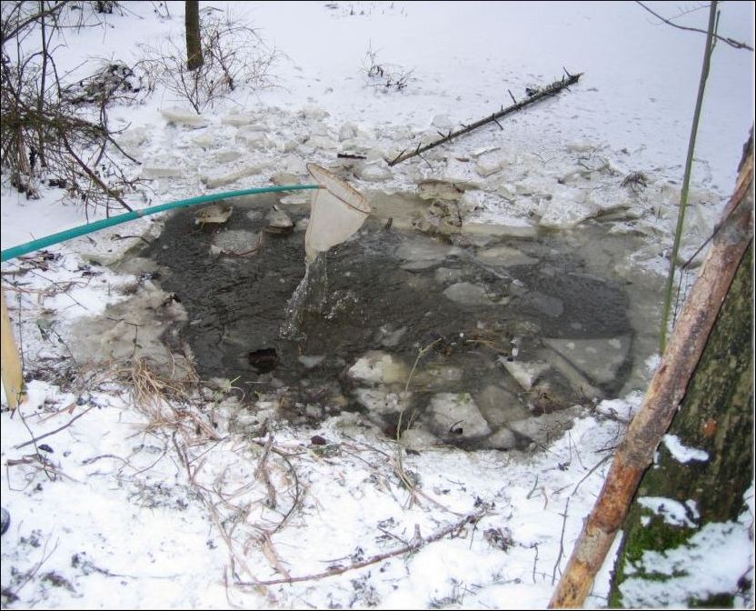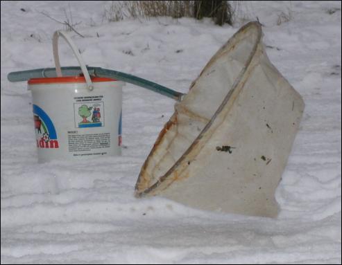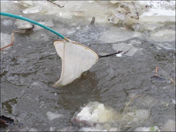 Tümpeltour: 29./30. Januar 2005Futterfang an einem Himmelsteich (Tümpel ohne Zu- und Ablauf) Bei einer mehreren Zentimeter starken Eisschicht ist Futterfang alles andere als ein Vergnügen: es war widerlich kalt und am zweiten Tag auch ziemlich feucht (bei überfrierendem Regen). Man kann es als Hardcore-Tümpeln bezeichnen – aber es hat sich gelohnt! Neben für ausgewachsenen Hüpferlingen ("Cyclops") und deren Nauplien waren auch vereinzelte Weiße Mückenlarven sowie Eintagsfliegenlarven mit im Netz. Etwas doof an der ganzen Sache war nur, dass mein Kescherstiel letztendlich zusammen gefroren war und erst im Auto aufgetaut werden musste. |